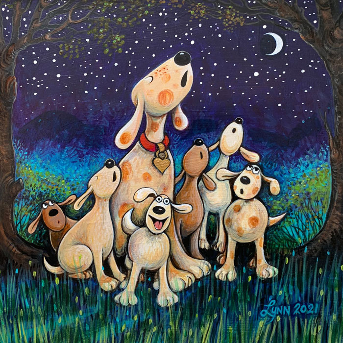 This goofy dog with the flower in his (or her) mouth was done for my granddaughter's bedroom wall. She likes it, which means a lot to me. I did a funny cat for my grandson which he has on his bathroom wall. Someday, when he wants one...I'll do a big painting for him as well.