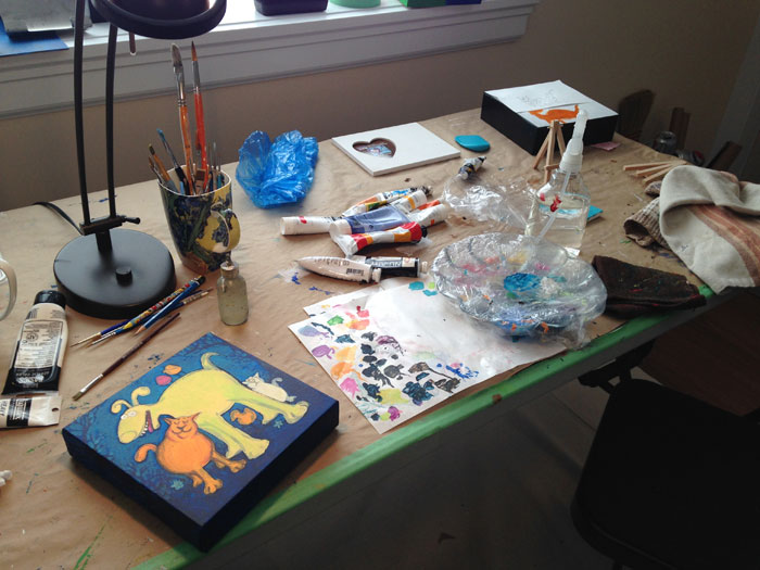 Just before we left North Bay, Ontario, I saw a sale on tiny canvases at a local art/craft shop and thought I'd take advantage. You never know when you'll need a 4X4" canvas, so I bought a bunch of them—I have friends who use them to try out new materials. I thought I'd putter about with cartoon animals in COLOUR, for a change, and these looked like a perfect size. What you'll see here are some fast experiments; some are on wood, others on canvas, and all are done with acrylic paint.