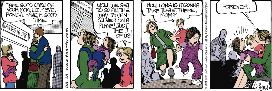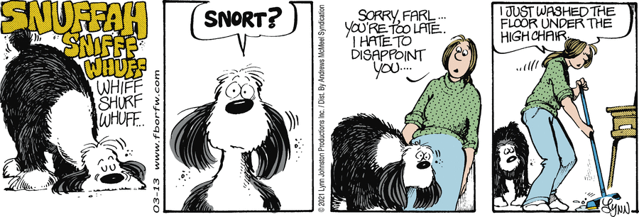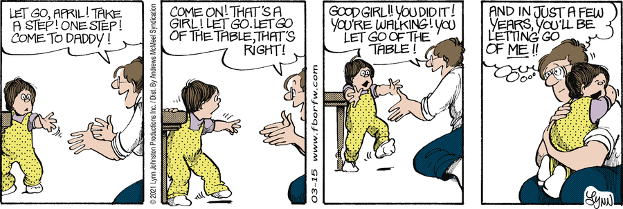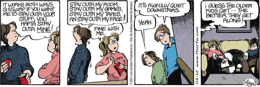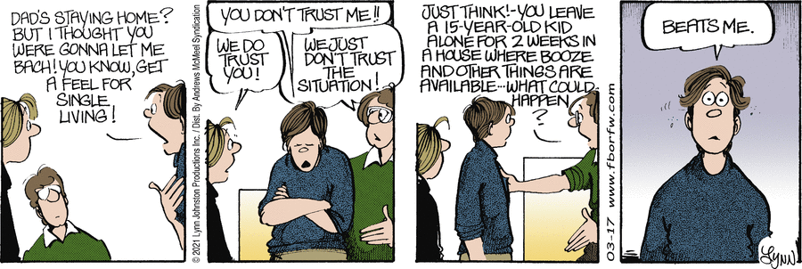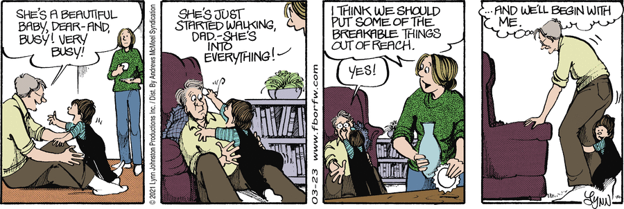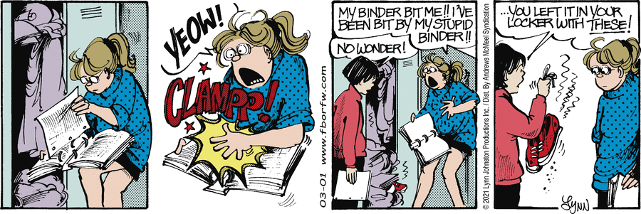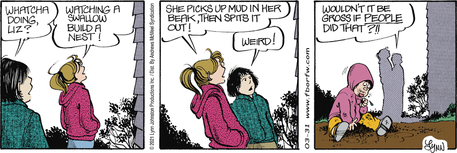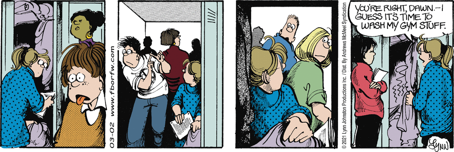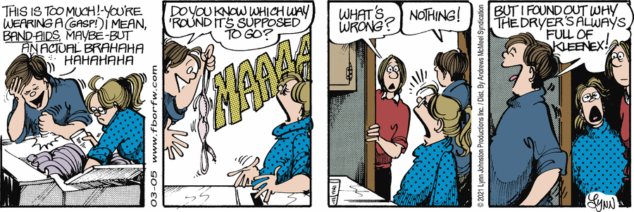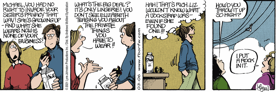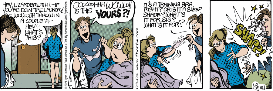 Lynn's Comments: I was hoping the item on the wire looked like a jock strap! When newspapers reduced the size of the comics page, we had much less space in which to make a gag work. Every square centimeter had to count and small details had to be drawn with real care so that they were evident to the reader. I hoped that I'd had enough space in the last panel to include the characters (for expression), the dialogue and the gag. Maybe not!