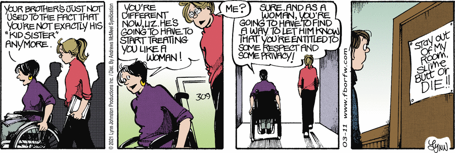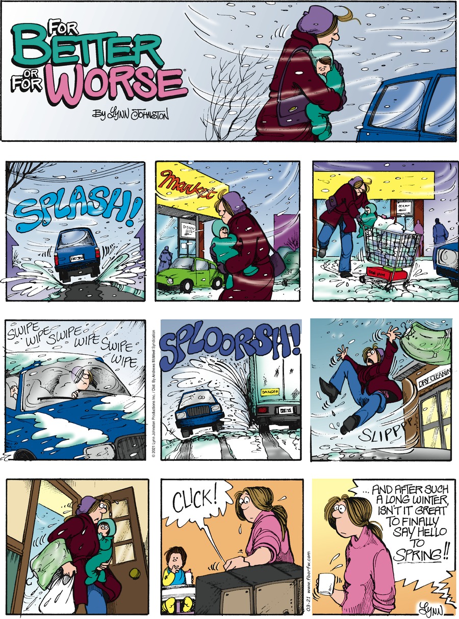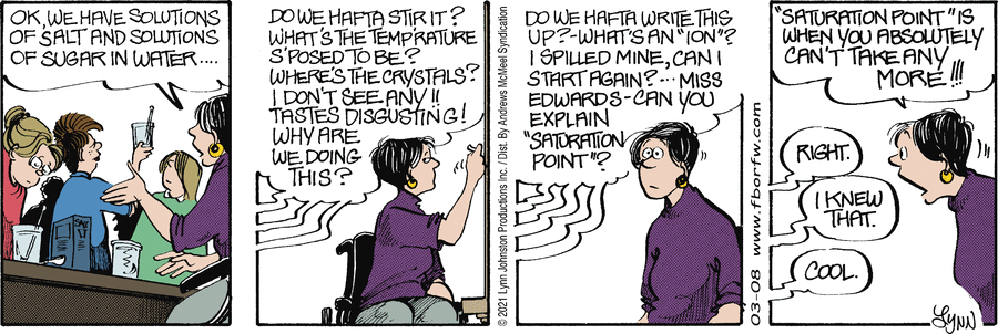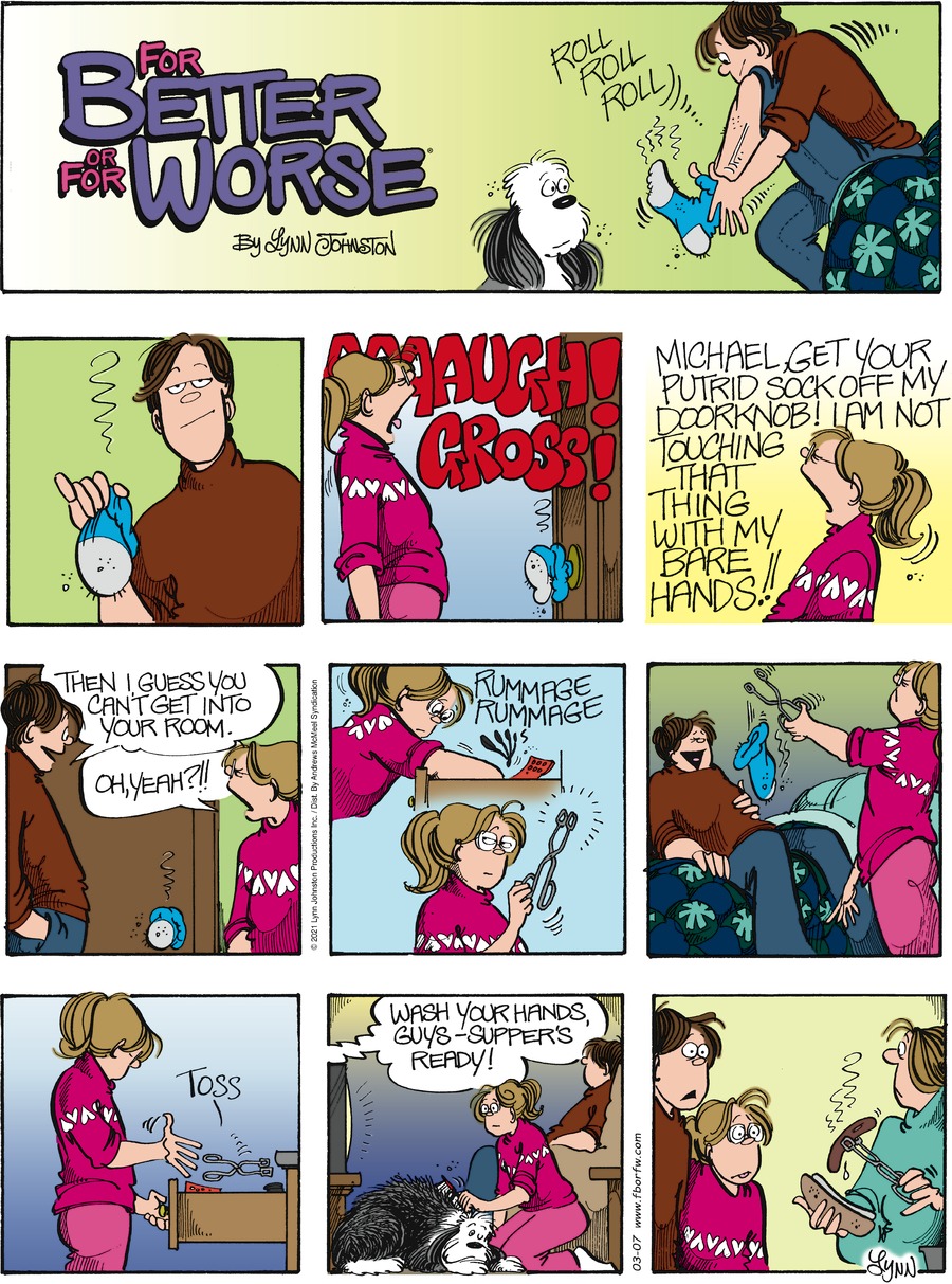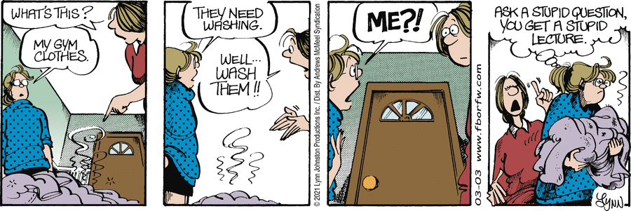 Lynn's Comments: Looking back on this strip, I had a hard time figuring out what Elizabeth was doing in the first panel here. She is stuffing her clothes into the washing machine. When I work with students, I always tell them to make sure the audience knows what they are looking at, that they use good reference so that appliances and machinery look right. Here, it seems, I didn't follow my own advice!