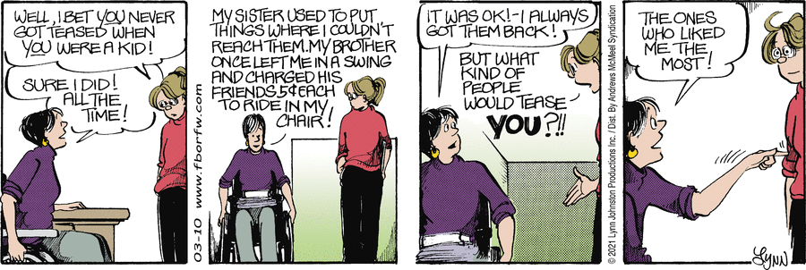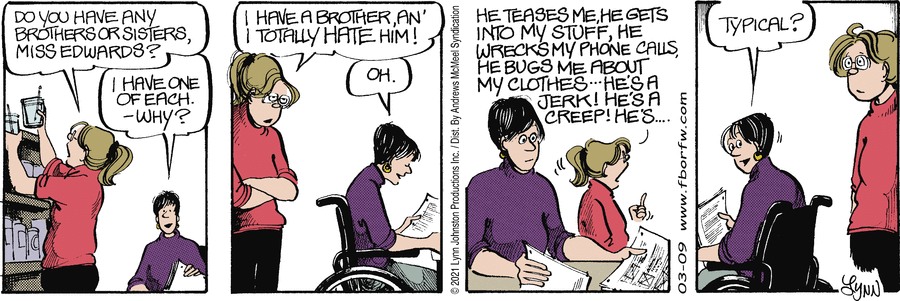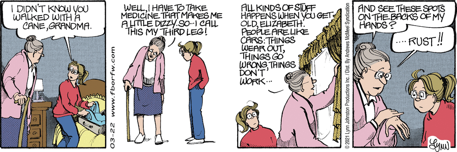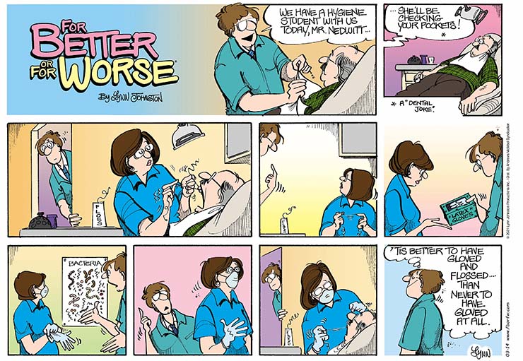 Lynn's Comments: I really got myself into trouble with this one. In the second panel, "checking pockets" was something that used to be done during a regular check-up. This involved using a probe to explore the depth of the tissue holding each tooth. The tiny spaces at the front, back and sides of each tooth are called "pockets." A healthy tooth has shallow pockets, meaning there is substantial tissue holding the tooth and the bone has not receded. "Long in the tooth" is when the bone recedes, the gum does as well, and the tooth root begins to show. I knew dentists and their staff would get the joke, but the general public might not... so I added the note, "a dental joke." It was not accepted as such. I did this strip for the sheer joy of the punchline, which was a dreadful pun. I was proud of it. The number of irate dental folks who wrote to tell me that checking pockets was NOT a joke, but a serious procedure and I should know better than to make fun of it. Well, excuuuuuse me!!! I was also on the carpet for suggesting that not all assistants wear gloves. In fact, at the time this strip was written (early '90s), wearing gloves was only just becoming a medical requirement. Yup. I apologized and explained my way through the letters, but the slap stung. This has been a long-winded explanation, but I'm glad to get it off my jest!